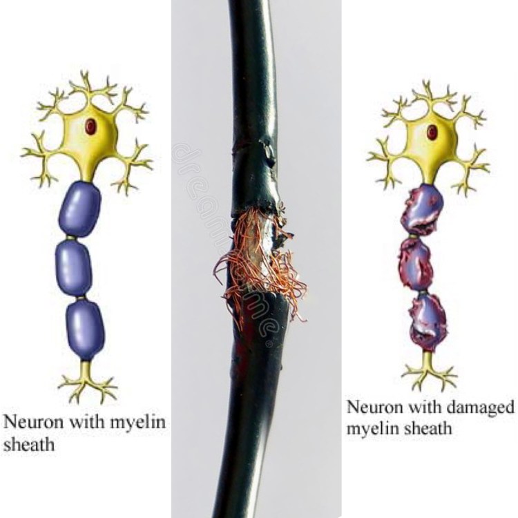 Second, a 75-word explanation of multiple sclerosis. “Sclerosis” means scar. Think of nerve cells like electrical wire. The wire, or axon, is what transmits the current; the coating, or myelin, creates a protected channel for the current. In MS patients, myelin is attacked by the immune system; think mice chewing on the electrical wire. The chew marks eventually scar. “Multiple” scars result in the nerve cells transmitting faulty or missing information. These scars are in the brain and on the spinal cord.